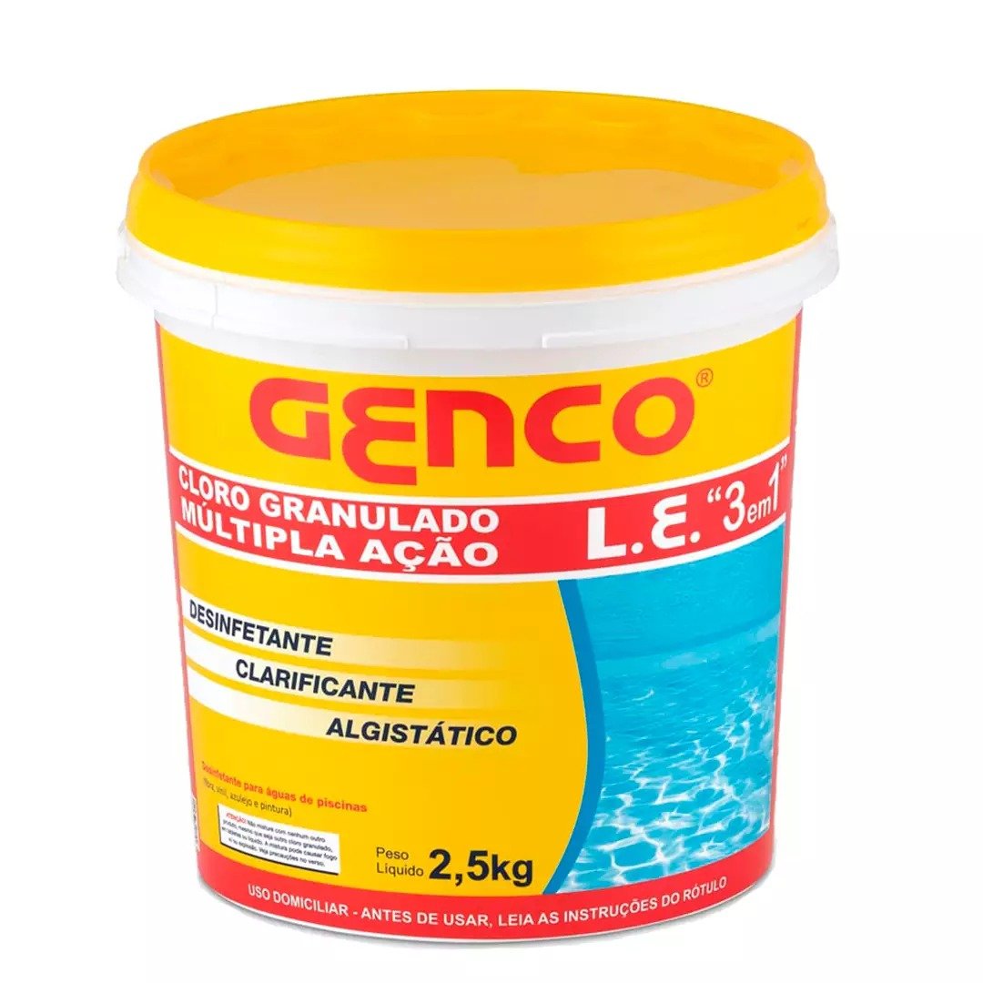 O Cloro Genco 3 em 1 de 2,5 kg é um produto granulado para piscinas que combina desinfecção (cloro estabilizado), clarificação (deixa a água cristalina) e ação algistática (previne algas) em um só, oferecendo praticidade e qualidade para tratamento contínuo, ideal para quem busca facilidade e eficiência no cuidado da piscina residencial, eliminando bactérias e mantendo a água límpa.