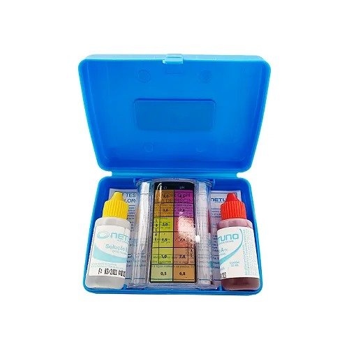 O Estojo de Teste pH/Cloro Netuno é um kit prático e acessível para monitorar a qualidade da água da piscina, medindo os níveis de pH (acidez/alcalinidade) e Cloro (residual sanitizante) através de reagentes (Fenol Vermelho para pH e Orto-tolidina para Cloro) e um comparador de cores, garantindo uma água segura, sem irritação nos olhos e com ação química eficaz.